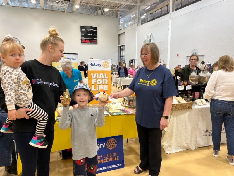 Rotarian Cathy LeBlanc explains the Carleton North Imagination Library program to a young family during Buttermilk Creek. One of the pillars that the Florenceville Rotary Club promotes and supports is literacy.