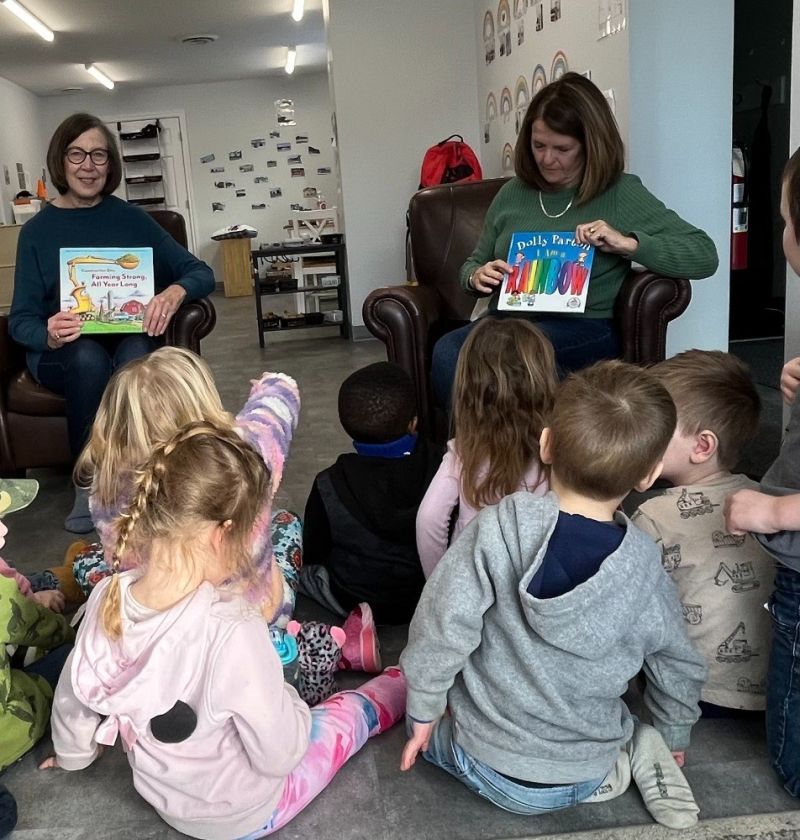 Rotarians Cathy Stephenson and Carol Brennan reading to children at the River Valley Early Education Center.