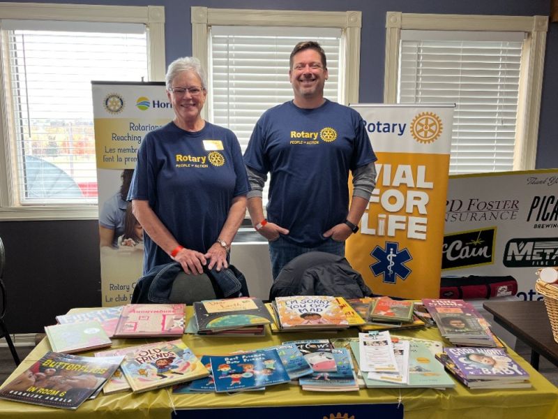Rotarian Carol Brennan and Chair of Carleton North Imagination Library with an information table at the Andrew & Laura McCain Library. The Dolly Parton Imagination Library is celebrating its 30 anniversary in 2025 and the Carleton North Imagination Library is celebrating 10 years. During these 10 years almost 29,000 books have been delivered to 1,310 children.